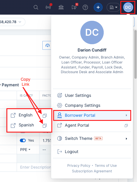 Loan Officers can copy their personal POS URL by clicking on their profile icon in the upper right corner of the screen and clicking the double square (copy) icon next to the Borrower Portal button. This copies the POS URL to your clipboard allowing you to paste it into your email signature, website, etc.