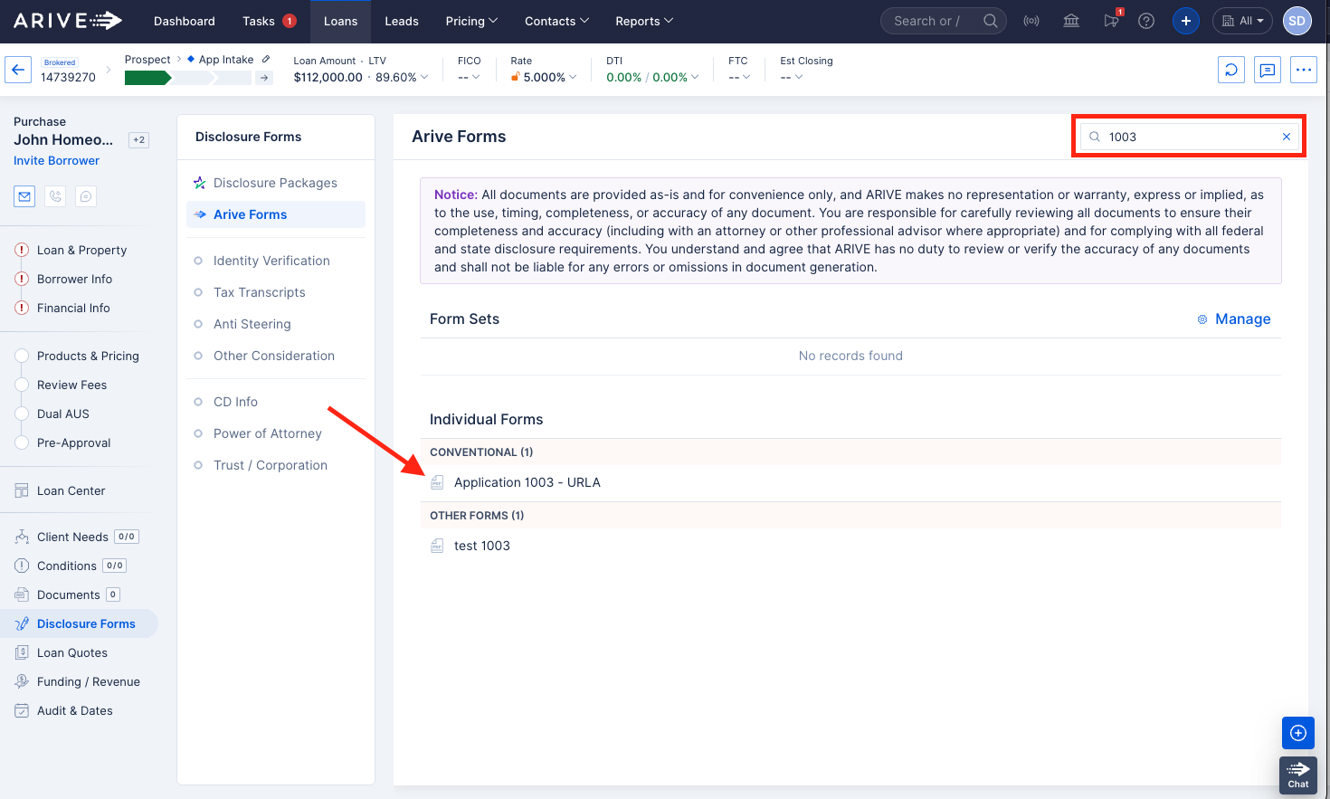 1. In your loan, select the Disclosure Forms tab from the menu on the left and select ARIVE Forms from the menu.