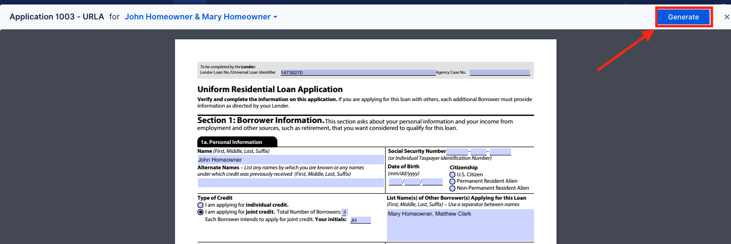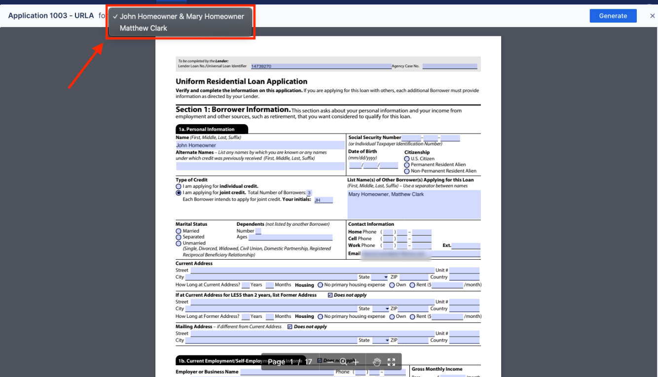 1. Regardless of where you generate the loan application form, you can select which 1003 (set of borrower(s)) you want to generate the form for by using the menu in the upper left corner.