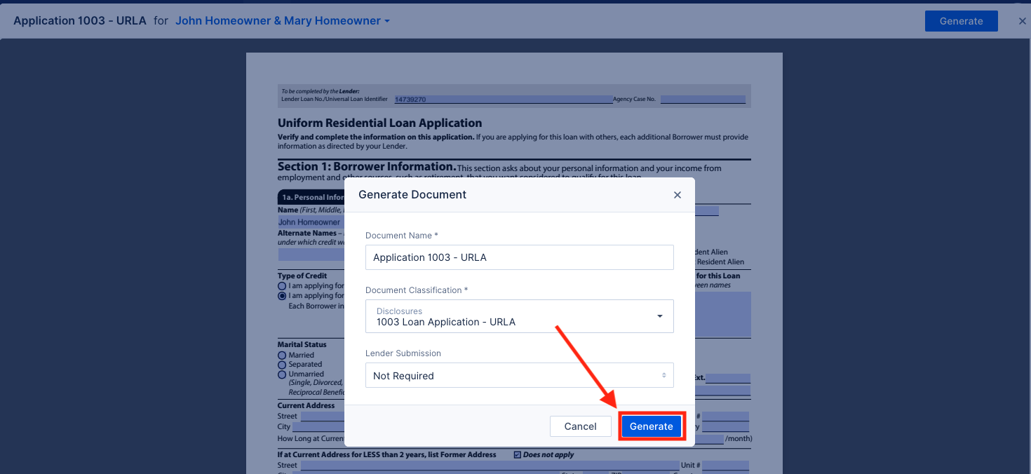 If you went through Disclosure Forms and click Generate, you'll be prompted to confirm or edit the Document Name and confirm or select the Document Classification and Lender Submission type. Then, click Generate.