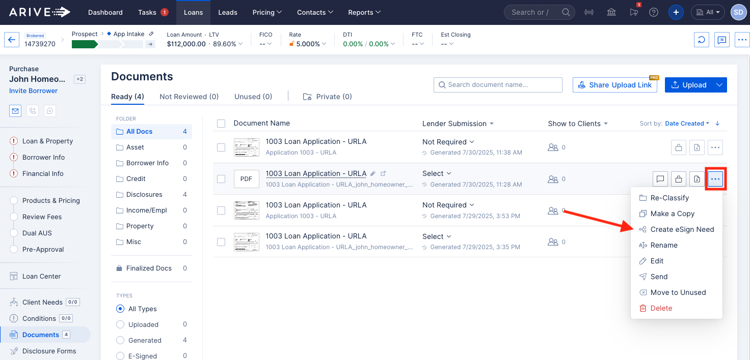 Create an e-sign need by clicking the ... button at the right end of the document's row and select Create eSign Need.