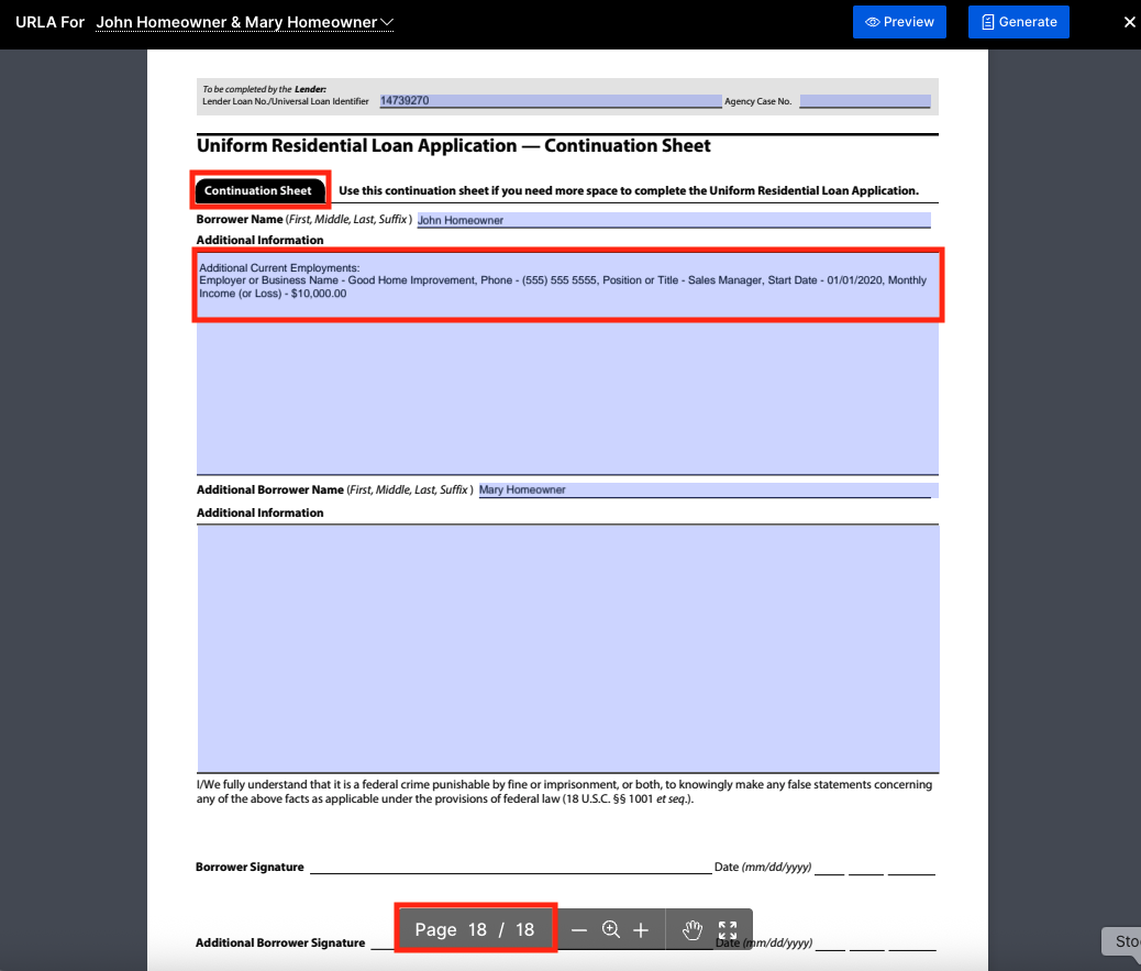 Important: The Continuation Sheet is automatically included at the end of the loan application form when there is additional information that exceeds the allotted fields in the applicable loan application section.