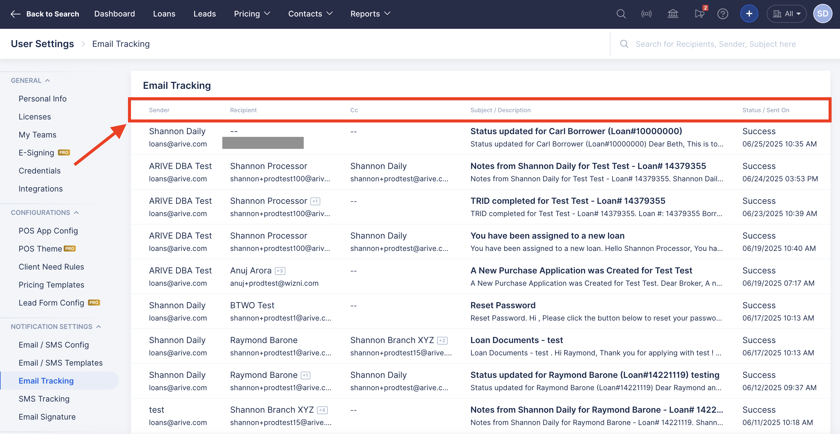 Email Tracking will allow you to view and search emails sent within ARIVE for various levels of the organization including: Company Settings, Branch Settings (if applicable), and User Settings.