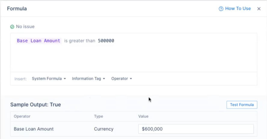 {{Base Loan Amount}} > 500000. - As you write, the editor will validate your formula. If there is an issue, a warning will appear.